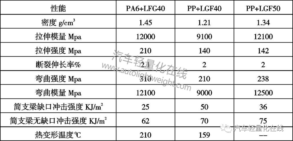 引言随着汽车工业的快速发展,能源短缺、环境污染等问题随之而生。近年来,在油耗、排放和环保法规的驱动下,轻量化成为汽车领域发展的主流方向。汽车轻量化是指在汽车原有性能不降低的情况下,通过优化结构、采用新工艺或新技术、采用轻量化材料来降低汽车自重[1]。研究表明,商用车整备质量每减少1000kg,百公里油耗可降低6%~7%,此外,汽车整备质量降低,还可提高汽车动力性与操控性,节省材料,降低生产成本。 在工程塑料改性技术的研发过程中,“以塑代钢”已成为流行趋势,对于重卡车型,采用“以塑代钢”是实现轻量化最有效的途径之一,其中长玻纤增强热塑性复合材料(以下简称LGF)具有密度低、比强度高、比模量高、尺寸稳定性好、易回收等优点,可以弥补短玻纤材料的不足,进一步实现重量、成本的降低,近年来发展迅速,在汽车零部件上的应用越来越广泛。 LGF在汽车复合材料工业中是指以热塑性树脂为基体,以长度超过10mm的增强玻璃纤维为骨架而混合生产成的制品。