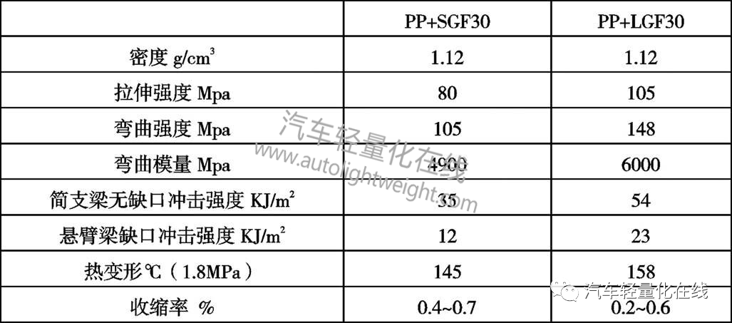 3 材料性能及优缺点LGF材料具有强度高、抗冲击性能好、比模量高、耐腐蚀性优良、耐高温性能、绝缘性能和隔热保温性能良好、抗蠕变性和耐疲劳持久性好、磨损低的特点,在大气环境中可长期使用。LGF与其他材料相比具有以下优点[8]: 3.1 与短玻纤(SGF)材料相比表3 PP+SGF30与PP+LGF30物性对比  LGF玻纤长度更长,排列更有规律,具有更强的刚度、比强度、耐蠕变性、耐疲劳性和稳定性。以PP+SGF30与PP+LGF30为例,其性能参数见表3,由表3可知,相同含量的玻纤增强聚丙烯,LGF的力学强度与SGF相比可提高30%左右,冲击强度可提高2倍左右,可作为SGF-PP 的代替材料,在同等强度下降低产品厚度,降低生产成本,实现轻量化。且LGF收缩率小,制品尺寸稳定性好,不会因吸水而影响其使用性能,可代替短玻纤增强尼龙类产品,在多种环境下长期使用。 3.2 与金属材料相比的差异(1)LGF材料密度低,多数在2g/cm3以下,而钢的密度为7.8g/cm3,铝的密度为2.6g/cm3; (2)LGF材料有非常高的比强度,较好的钢性、冲击性能、变形小等优点,合理选择树脂及玻纤含量可使其比强度比钢高2倍左右。可作为钢板或铝板的代替材料用于车身覆盖件或结构件; (3)综合成本低。在原材料成本、材料回收率及加工设备等方面,LGF制件的成本与金属制件相比,均具有一定的价格优势。 3.3 与SMC材料相比差异[9](1)操作工艺环境良好,是一种绿色环保材料; (2)可回收利用,原材料回收率较高,减少浪费,降低成本; (3)强度及抗冲击性能较SMC材料高; (4)材料成型性好,处理工序少,生产效率高。 3.4 材料的缺点及改进方向3.4.1制品表面玻纤外露 LGF由于其玻纤含量较高、纤维较长,制品表面易出现浮纤现象,较难达到车身外部装饰件要求,因此一般用于骨架件、结构件或外观要求比较低的零部件。 3.4.2涂覆较困难 聚丙烯材料的综合性能良好,目前大部分热塑性复合材料均选择聚丙烯树脂为基体,但聚丙烯材料的非极性较高,表面能低,与油漆或涂料之间的层间附着力较小,涂覆较困难,容易脱落。 针对上述两点缺陷,可从以下几个方面进行改进: (1)选择熔融指数较大的树脂,或者改进树脂配方,降低粘度,增加树脂对玻璃纤维的浸润性,减少玻纤外露现象,满足外观要求; (2)采用腐蚀花纹的处理方式,掩饰表面问题,提高外观性能,如采用磨砂纹、皮纹、颗粒纹等[10]; (3)采用胶黏剂使贴膜与外饰件贴合的方法,改善外观质量,在美化外观的同时降低表面处理成本。