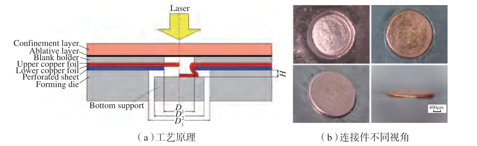 此外,一些学者也开始借助一些特殊能场来实现板材连接。Babalo等[17]提出一种电液铆接新方法,将电液成形应用于薄板铆接中。储存在脉冲发生器中的电能在浸没于液体中的电极之间突然放电,并在液体中引发冲击波,冲击波使板材变形并形成接头。采用该方法获得了0.5mm厚度的AA3105/Ck67 薄板的孔铆连接件,确定了工艺参数对接头质量的影响,单搭剪切和剥离试验结果表明,该连接工艺的应用提高了接头的强度,其连接效率约为其他孔铆连接方法的两倍。激光冲击铆接成形新技术(Laser shock clinching,LSC)是一种利用脉冲激光诱发的高压冲击波,对板材进行无铆钉铆接的新方法,在电子、微制造等领域具有潜在的应用前景。Wang 等[18–19]采用该工艺实现了预制孔不锈钢板与单层和双层铜箔之间的连接,图5为该工艺原理及获得的不锈钢板–双层铜箔的铆接件,研究表明在合适的激光能量和成形高度下才能获得良好的连接件,接头的抗剪强度远远大于剥离强度。Wang 等[20–21]利用激光冲击对1060 铝箔、铜箔和304 不锈钢箔进行了微铆接,通过特定的模具实现对底层箔材的剪切并形成锁扣结构,并研究了激光能量对颈厚值和最小壁厚的影响规律。