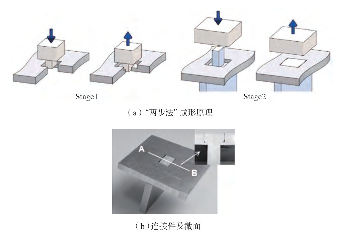 “榫卯结构”是古代建筑中木构件的一种常用连接方式,近年来,“榫卯结构”也被逐渐应用于金属板材间的连接中。Silva 等[28]提出了一种将切缝剪切与板料体积压缩相结合的成形连接工艺,用于制造作为能量吸收器的薄壁防撞箱,比较了新型防撞箱与传统点焊防撞箱的整体耐撞性能,结果表明,这种焊接工艺可以很好地替代电阻点焊。Bragança 等[29]提出了一种室温下垂直板材间的“榫卯”连接方法,基本原理为在平板上预制矩形孔(卯),在垂直板端部预制突出的榫头,将榫头穿过矩形孔后采用模具对其端部压缩,从而实现二者间的连接。但该方法在连接部位仍存在突出部分,在对连接件外观要求严格的表面仍难以满足要求。针对该问题,Silva 等[30]提出了一种两步法获得垂直板材间连接接头的方法,其原理和获得的连接件如图7所示,首先通过在厚度方向部分压缩其中一块板来获得阶梯型的榫槽,然后通过在垂直于榫槽厚度的方向上镦粗榫头,以完全填充榫槽,采用该方法可获得表面平整的接头。对于平行板材间的连接,榫头无法像垂直板材间通过去除材料的方式制造,Silva 等[31]提出一种电弧熔丝增材制造与塑性成形相结合的方法来获得板材间的搭接接头,上部板材预制榫槽,下方板材通过电弧熔丝增材制造的方法制造榫头,然后压缩榫头实现平行板材间的连接。该方法可以获得任意形状和厚度的榫头,拓宽了工艺适应性。Baptista等[32]提出了一种金属–聚合物三明治复合板搭接接头制造新方法,其成形过程及获得的搭接接头及剖面如图8所示,通过在金属–聚合物三明治复合板钻盲孔,去除表层的金属板和中间层的聚合物板,然后在二者之间盲孔部位放置金属镶块并压缩使其变形,从而获得三明治板材的搭接接头,表面无凸起。