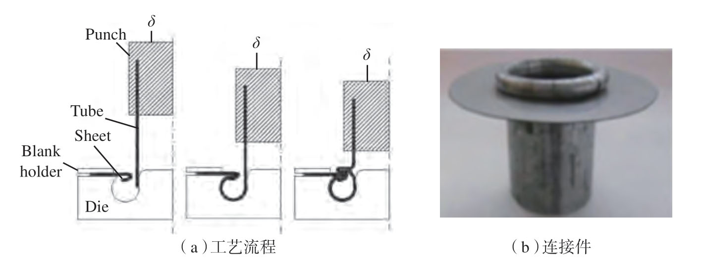 Alves 等[33]在板材–管材塑性连接工艺上进行了大量的探索,提出了一种在室温下通过塑性变形将管与平板固定的连接工艺,其原理如图9所示,主要是通过对管材端部进行局部挤压形成凸台,将板材置于凸台上后,再通过扩口模对管材端部施压,从而实现管材端部与板材之间的连接,通过该方法获得了铝合金管与钛合金、钢和聚碳酸酯塑料的连接件。