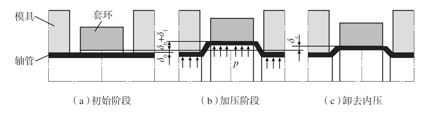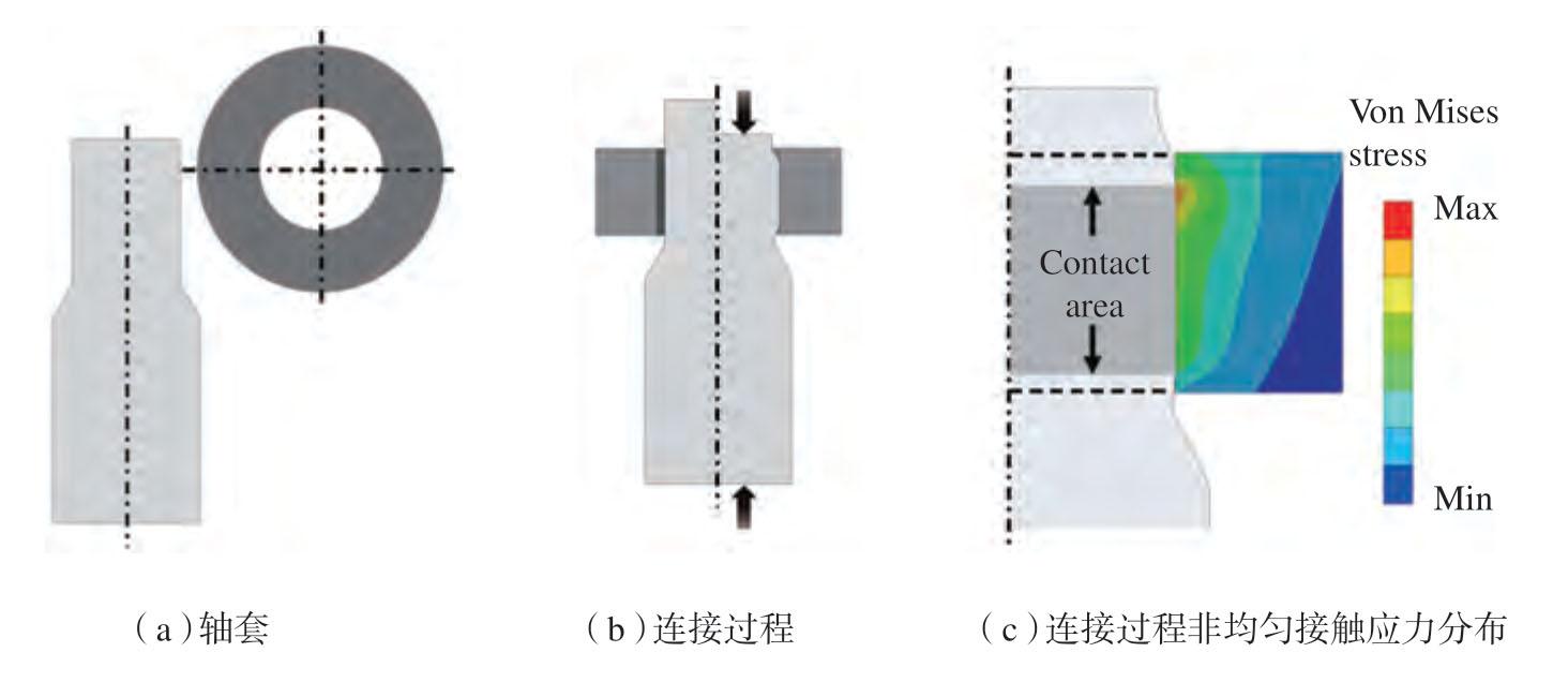为了达到在板材与管材任意位置的快捷连接,且保证表面美观程度, Alves 等[39]提出了一种基于板材周向挤压的连接工艺,通过挤压紧邻管材部位的薄板,材料沿内径方向塑性流动使得管材缩颈变形,实现二者的快速连接。将试验和有限元建模相结合,确定了主要工艺参数对塑性流动中的影响,并分析了完好和失效接头的不同变形模式。传统的挤压工艺也被应用于轴套连接中,通过挤压芯轴使其发生塑性变形而实现连接,如图11所示,然而接触面上产生的非均匀接触应力分布影响到连接强度。为此,Meissner 等[40]采用数值模拟方法获得挤压连接工艺中需求的制造精度和工艺窗口。Kitamura 等[41]提出一种室温下轴与法兰的挤压连接方法,先在室温下通过锯齿模具挤压,在轴的端部制造锯齿,对锯齿部分进行渗碳和淬火处理提高硬度,然后轴的锯齿端部作为模具挤压进入预制孔的法兰中,对法兰孔内径材料进行去除,并实现二者的连接。采用该方法获得的连接件的屈服扭矩为采用机械组装方法的1.5倍。