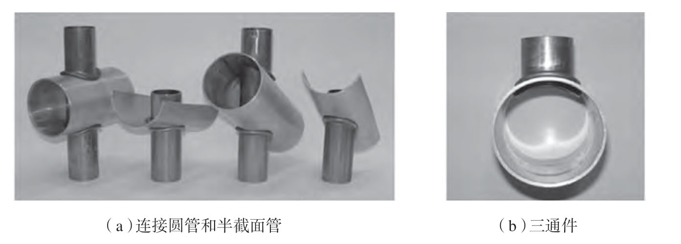 Silva 等[59]对管端部连接工艺进行了改善,主要是对上、下模增加了环形凹槽,可以实现连接管之间更好的定位,同时搭接部分长度更长,且带有平直段,在输送液体或气体时也可以使用。拉伸、扭转、弯曲和密封性破坏试验结果表明,新的“搭接”接头的性能均胜过“对接”接头。然而上述方法会在连接部位外端产生环形的凸起,影响到产品外观和美观性。Alves 等[60]提出一种通过内部机械互锁实现管材间塑性连接的方法,此方法会在管内部形成凸起,外部无凸起,美观性有了一定提升。通过管材塑性失稳的方法,也能够用来实现不同直径管材间的垂直连接和倾斜连接,以及三通管的制造(图20)[61]。Baptista 等[62]将电弧熔丝增材制造技术与塑性成形相结合,通过电弧熔丝增材制造技术在型材交接处制造榫头,用来制造空心界面铝型材的十字接头(图21),研究表明,十字节点的单元能够承受2kN的拉脱力和3.2kN的剪切破坏力,可用于制造低成本铝材结构件,在公共汽车、火车或轮船等客运车辆上具有潜在的应用。