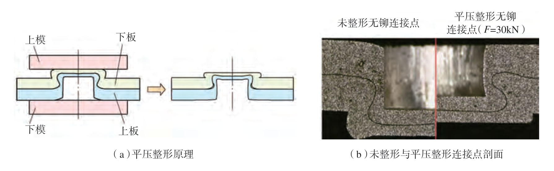 铆接是常见的板材间机械连接工艺之一,无铆连接和平底铆接是近年来发展起来的无辅材塑性连接新工艺。然而,无铆连接在连接点处一侧形成凸起,另一侧形成凹坑,影响其美观程度。Chen 等[3]提出了一种用整形铆钉对铆接接头进行整形的新方法,以降低凸出高度,提高连接强度。在整形过程中,将整形铆钉嵌入到铆接处,然后用平模在一次行程中压缩突出部分。通过有限元模拟和试验研究,优化了整形铆钉的几何参数,并验证了该方法的有效性。由于该方法加入了整形铆钉,增加了连接件的重量。为了克服这个缺点,进一步提出一种适用于汽车铝合金板材的平压整形无铆连接技术,其原理如图1所示,通过分瓣式模具和平滑模具获得平压整形无铆连接点,研究表明,平压整形无铆连接技术在降低凸起高度的过程中可增加颈厚值,从而有效提高连接点的强度和能量吸收能力,整形力为30kN时,平压整形无铆连接点的强度比未整形无铆连接点的强度增加了16.3%[4–5]。此外,断裂是平压整形无铆连接点的主要失效模式。平底无铆塑性连接工艺是通过专用的平底无铆塑性连接模具,利用板材的塑性变形能力,在外力的作用下迫使被连接的板材在连接点处产生材料流动,使板材之间形成一个相互镶嵌的倒置Ω 形状的机械锁,从而实现不同板材之间的连接,且与板材接触的平底模具的平面是光滑平整的。韩晓兰等[6]针对平底无铆塑性连接铆接头的抗拉强度检测成本高、周期较长的问题,建立了平底无铆塑性连接抗拉强度预测模型,并通过试验验证了抗拉强度预测模型的准确性。Gerstmann 等[7]通过数值模拟研究了平底铆接–粘合混合工艺成形过程,结果表明粘合固化后进一步提高了连接强度,并结合试验对如何减小粘结剂死区尺寸进行了粘结层厚度、压边力等参数优化。