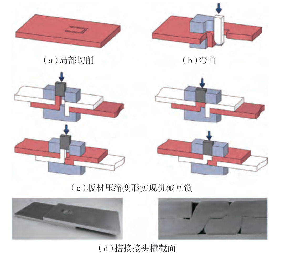 Wang 等[22]在无铆连接中引入一种含碳纤维增强塑料预浸料和铝粉的夹层结构,应用于碳纤维复合材料板与铝合金板的连接。研究表明预浸料能有效地填补板材变形产生的空隙,机械联锁与树脂粘接相结合,提高了接头的可靠性。初明明[23]和赵得锁[24]等研究了泡沫金属对压印-粘接复合接头力学性能的影响,将泡沫铜、泡沫镍和泡沫铁镍作为复合接头三明治结构的夹层,分析不同泡沫金属夹层对Al5052–Al5052 压印接头成形质量(峰值载荷、失效位移和能量吸收能力)的影响。针对金属板材连接成形时在厚度方向上承载能力较差且易产生脱落等问题,李峰等[25]提出一种对板材端部预加工出一定形状的凸齿、孔洞或凹槽,将处理后两板材的连接端部进行匹配搭接,冲头对连接部位加载使其发生塑性变形,实现板材间的连接。针对不等厚度的不锈钢板与铝板进行了板材搭接工艺研究,预先设计好端部形状,交叉连接后通过模具进行压缩连接。利用有限元模拟软件DEFORMTM–3D 模拟了连接过程,试验与仿真结果较为吻合 [26]。Pragana 等[27]提出了一种通过局部切口、弯曲和板料压缩获得搭接接头的新方法(图6),对该接头工艺参数进行了试验与模拟研究,获得的搭接接头表面无凸起,但连接过程较为复杂。