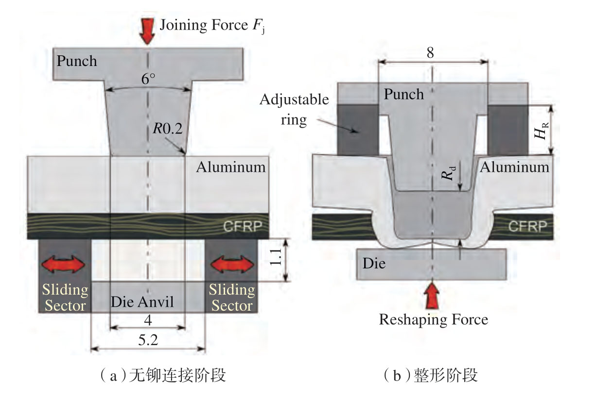 碳纤维增强复合材料由于具有较高的比强度、比刚度,轻量化效果明显,因此也受到越来越多的关注。金属–复合材料混合结构由于能够大幅度减轻产品重量、节省燃料,在运输业、民用基础设施和建筑业等领域的应用越来越广泛,实现碳纤维增强复合材料与铝合金等轻量化金属材料间的连接具有重要的应用价值。然而,两种材料间性能的巨大差异,对金属–复合材料混合结构的连接提出了挑战。Lambiase 等[12]探讨了AA6082–T6/碳纤维增强聚合物(CFRP)薄板的铆接工艺的可行性,结果表明,采用带滑动功能的分瓣模来铆接铝和碳纤维复合材料薄板是可行的,接头在破坏试验中均以脱出的形式失效,因此,颈厚值是铆接过程中需要重点关注的参数。在此基础上,提出了两步铆接法实现碳纤维增强复合材料与铝合金之间的有效连接,其成形原理如图3所示,第1步通过分瓣滑动凹模实现二者的无铆连接;第2步更换整形模具,通过在凸模下方放置不同高度的圆环,实现不同的整形深度Rd(0.5~2.0mm),整形模具对铆接点施力并压缩其高度,研究了整形模具形状和整形力对铆接点剪切强度和吸能性的影响规律,采用优化的整形模具获得的铆接强度较未整形条件下提高了32%[13]。