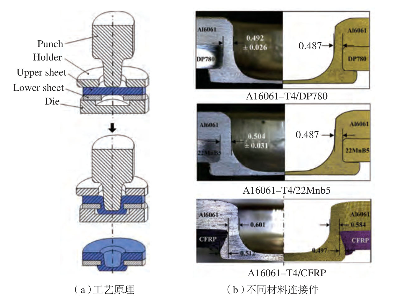 唐华清等[14]提出了一种金属与复合材料间的胶–多金属细针的新型连接方法,并对传统胶接接头和胶–多细针接头进行对比试验研究,发现新型胶–多细针接头在极限破坏载荷、破坏应变和能量吸收量等方面均有提高,细针与连接件的桥联作用力起到抑制胶层开裂的作用,从而提高承载能力和可靠性。Lee 等[15–16]针对高强度、低塑性材料机械连接方面存在的问题,提出了一种“孔铆连接”新工艺,其连接原理及获得的连接件截面如图4所示,首先将韧性材料放置带有预制孔的脆性材料上方,凸模下压,韧性材料底部压薄,并填充凹模型腔,实现铝合金等材料与先进高强钢、热压钢、碳纤维增强复合材料等高强度/低塑性材料间的有效连接,通过有限元分析和试验进一步验证了该方法的可行性,获得了达到要求的接头质量。