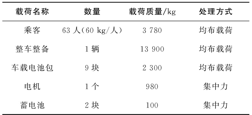 通过ADAMS/Car对纯电动城市客车进行整车仿真,获得满载弯曲工况与扭转工况中各载荷沿竖直方向的动态峰值力。其中,在满载弯曲工况中,乘客及整车整备动态峰值力为182720N、大电池包动态峰值力为3465N、小电池包动态峰值力为1980N、电动机动态峰值力为9995N和蓄电池动态峰值力为1072N;在扭转工况中,乘客以及整车整备动态峰值力为215225N、大电池包动态峰值力为4389N、小电池包动态峰值力为2321N、电动机动态峰值力为12382N和蓄电池动态峰值力为1352N。将获得的动态峰值力与静载荷的大小比较,如表2所示。 表2 底盘车架各载荷动态峰值力与静态载荷比较