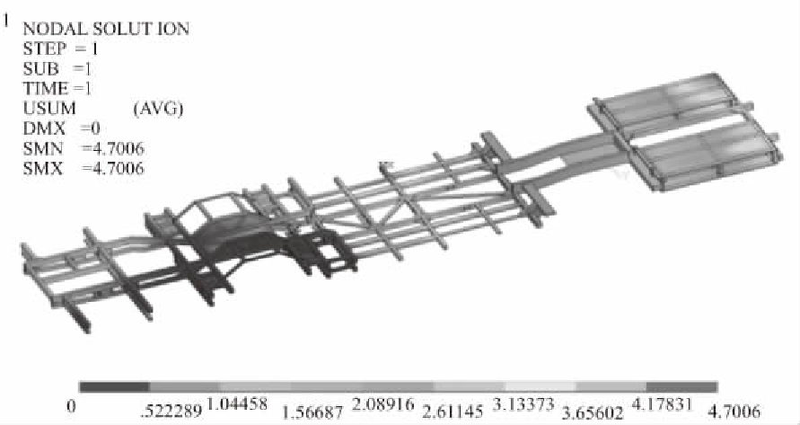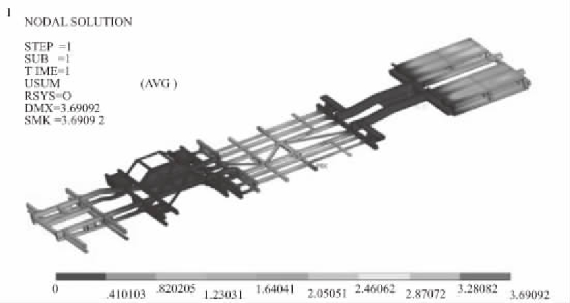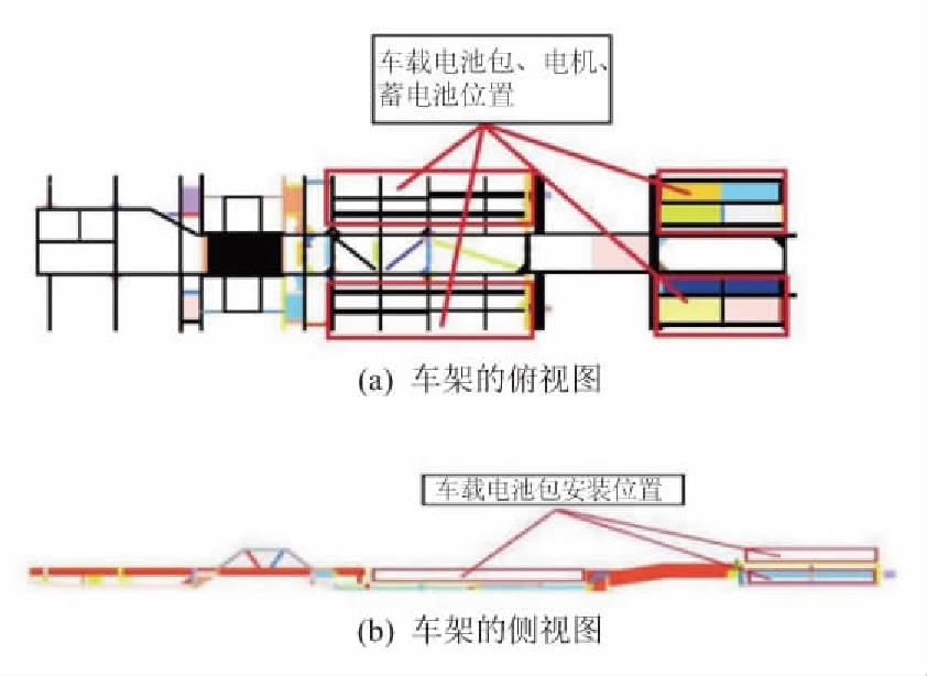 2.2 客车车架有限元分析计算将客车动态仿真所提取的各总成动态峰值力施加到车架有限元上,作为分析的荷载约束,在ANSYS计算软件中对客车车架满载弯曲工况与扭转工况(右前轮下沉)进行有限元分析计算,得到两种工况下的应力云图与位移云图,如图7和图8所示。两种工况下的最大应力值均低于材料屈服极限345MPa。满载弯曲工况下,最大应力位置在后段车载电池包支架与右后轮架连接位置,最大应力值为138.09MPa,最大变形位置在车架中段小电池包左侧支架处,最大变形量为3.69mm,安全系数为2.5;扭转工况(右前轮下沉)下,最大应力位置发生在后段车载电池包支架与左后轮架连接位置,最大应力为196.8MPa,最大变形位置发生在车架中段小电池包右侧支架,最大变形量为4.70mm。两种工况下的应力与变形情况总结如表4所示。已知车架材料Q345的最大屈服强度为345MPa,取安全系数为1.5,而应力状况最差工况——扭转工况下的最大应力为196.8MPa,安全系数为1.75,>1.5,因此客车底盘车架在刚度和强度方面存在较大的可优化空间。