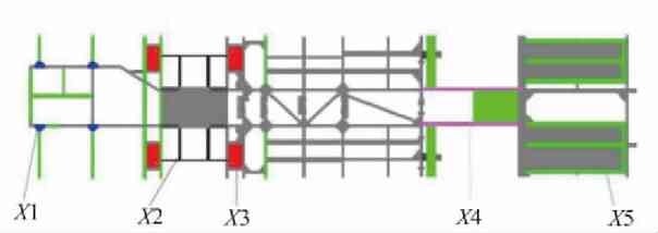 3 客车车架基于动态峰值力的设计优化3.1 设计优化理论基础该纯电动城市客车车架长约12m、宽约2.5m、高约3.2m,主要由不同厚度的矩形钢和槽型钢构成。根据客车的二维图形在三维建模软件SolidWorks中建立客车的三维模型,将导出的stp格式三维模型导入SpaceClaim软件中进行前处理;将抽取完中间面并且简化完成的模型导入到HyperMesh软件中,对模型进行几何清理和网格划分。网格单元尺寸选择为10mm,模型划分完网格后的网格数目为600369,节点数目为592037。有限元模型如图5所示。车架的材料属性见表3所示。车载电池包安装位置及荷载分布情况如图6所示。 优化设计的数学模型为[15]: 目标函数 f (W) = f (w1, w2,…,wn) 约束条件 3.2 客车底盘车架参数化优化设计本文运用Optistruct模块中的Optimization命令,对客车底盘模型做参数化优化设计。设计目标函数f(W)是车架质量最小;定义约束为车架的应力和变形的上限值;设计变量为零件的厚度:X1、X2、X3、X4、X5,要求是应力小、变形小的左右两侧梁以及前后横梁,如图9所示。已知模型在扭转(右前轮下沉)工况下的最大应力为196.8MPa,最大变形为4.70mm,将应力约束的最大上限值定为200MPa,最大变形量放宽到10mm。  图9 优化位置