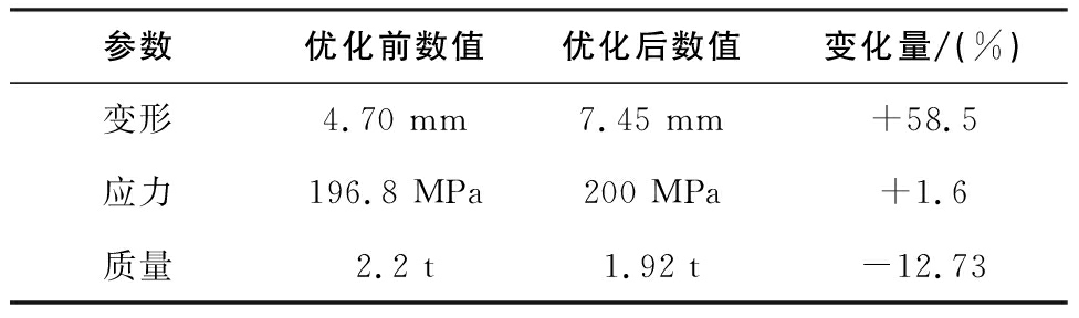 3.3 优化结果分析与对比根据客车车架的优化结果,将优化后的客车底盘车架重新建模,对其进行静强度分析,校核应力要求最高的扭转(右前轮下沉)工况,图11表示优化后的扭转工况下变形云图与应力云图。客车底盘车架优化后扭转工况下的最大应力为200MPa,最大变形为7.45mm,符合底盘钢Q345的强度要求。表6所示为优化前后扭转(右前轮下沉)工况下应力与位移结果对比。 表6 优化前后各响应参数对比