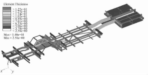 优化时的迭代次数为9次,最后一步迭代壳厚云图如图10所示。优化开始前车架的质量为2.2 t,优化完成后车架的质量为1.92 t,相比较减少了12.73%。表5所示为各设计变量优化前后的数值对比。  图10 最后一步迭代壳厚云图