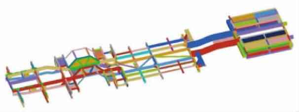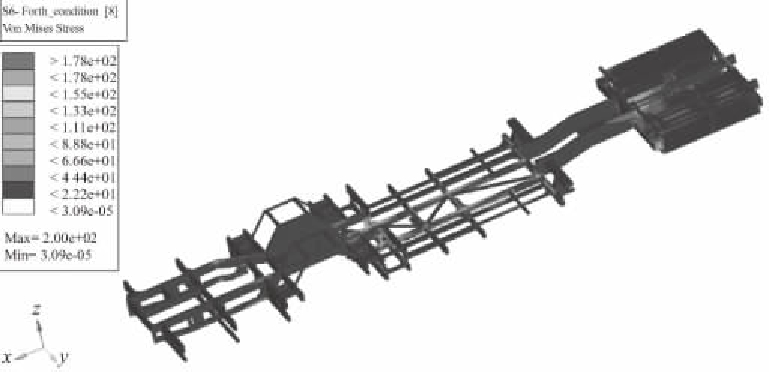 4 结语本文运用ADAMS/Car软件搭建了整车虚拟样机模型,然后在C级路面模型中模拟得出满载弯曲工况和扭转(右前轮下沉)工况下与车架连接的各载荷的动态载荷峰值力,最后建立客车底盘车架有限元模型,以动态峰值载荷力为荷载约束,对车架进行有限元分析。结果显示,应力状况最差工况——扭转(右前轮下沉)工况下的最大应力为196.8MPa,最大变形为4.70mm。利用参数化优化设计对客车底盘模型进行优化,优化完成后的车架质量减少了12.73%,车架的最大应力为200MPa,最大变形为7.45mm,满足强度与刚度要求。基于动态峰值力对客车底盘车架进行有限元分析时不必考虑动载系数的取值,提高了有限元分析的准确性。