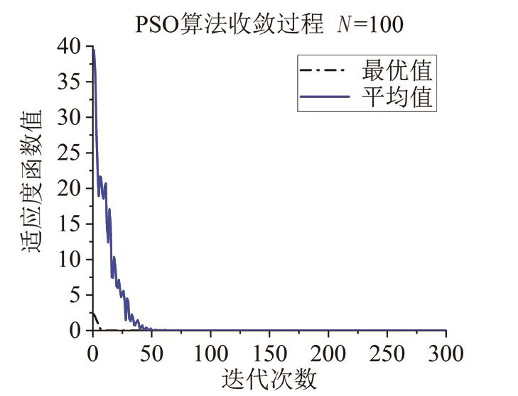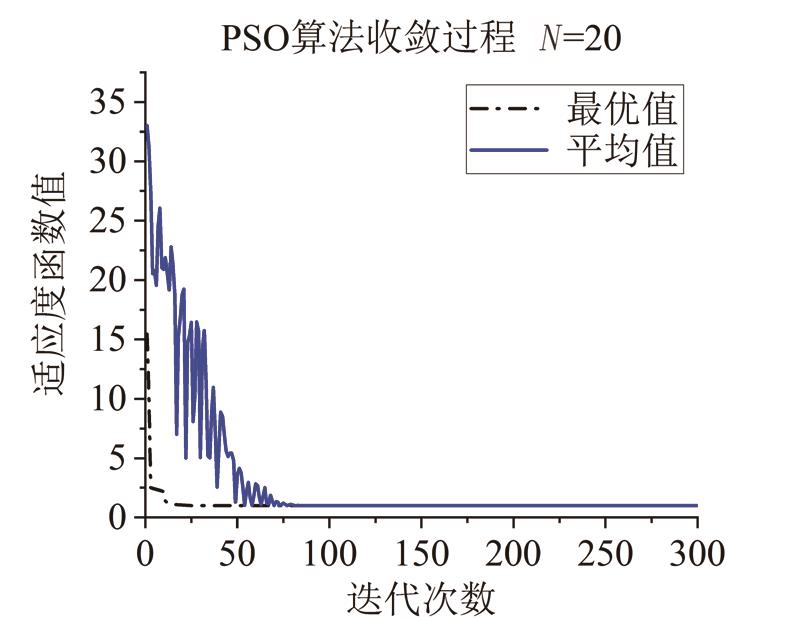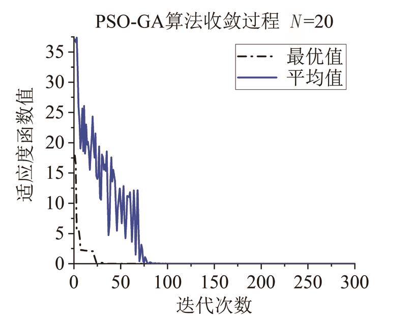 从中随机选取1组测试结果的迭代曲线如图2和图3所示。通过图2和图3,可以看出PSO算法和PSOGA算法都是收敛的,在算法运行的初期,迭代次数小于80次时,个体的适应度函数值的平均值出现波动,但总体呈减小趋势,波动反映出粒子在进化运动过程中函数峰值的影响。将种群规模N=20时,PSO算法和PSO-GA算法的迭代曲线综合起来作仿真结果对比分析,如图4所示。  图 2 PSO算法迭代曲线