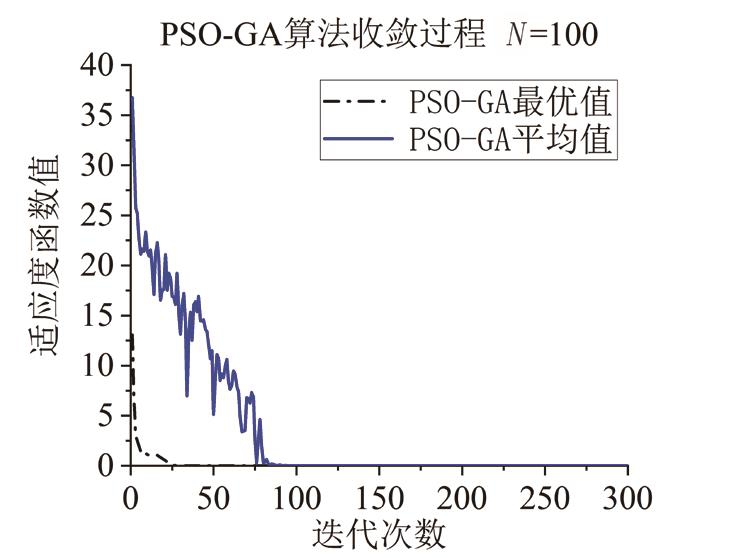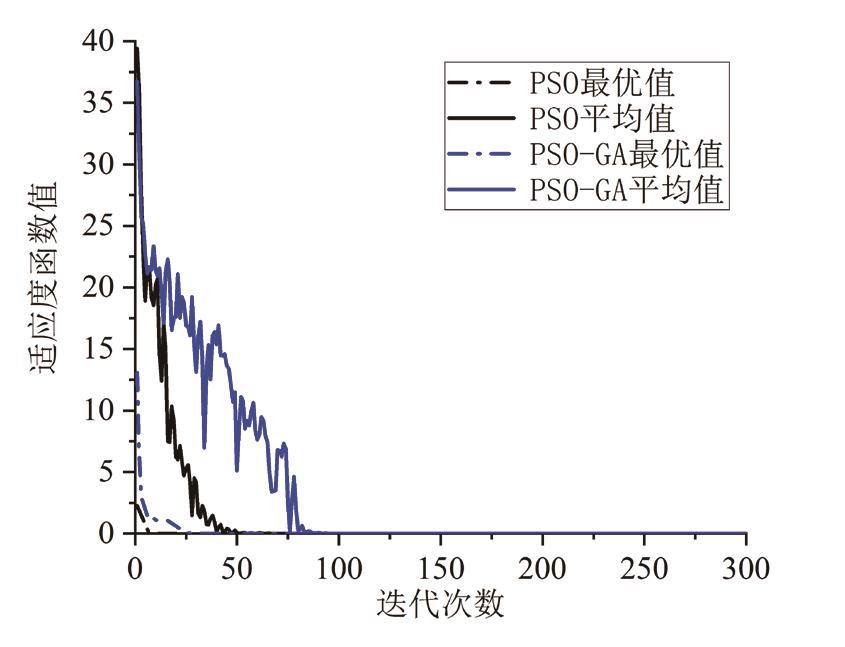 从图5和图6中可以直观地看到PSO算法迭代到10次左右得到函数最小值,随着迭代次数的增加,在迭代到50次左右时,个体适应度函数的平均值基本接近最优值,表明个体全部到达最优位置附近,种群停止进化;PSO-GA算法迭代到25次左右得到函数最小值,迭代到90次左右时,个体适应度的平均值基本接近最优值,表明种群停止进化。将种群规模N=100时,PSO算法和PSO-GA算法的迭代曲线综合起来作仿真结果对比分析,如图7所示。  图 6 PSO-GA算法迭代曲线