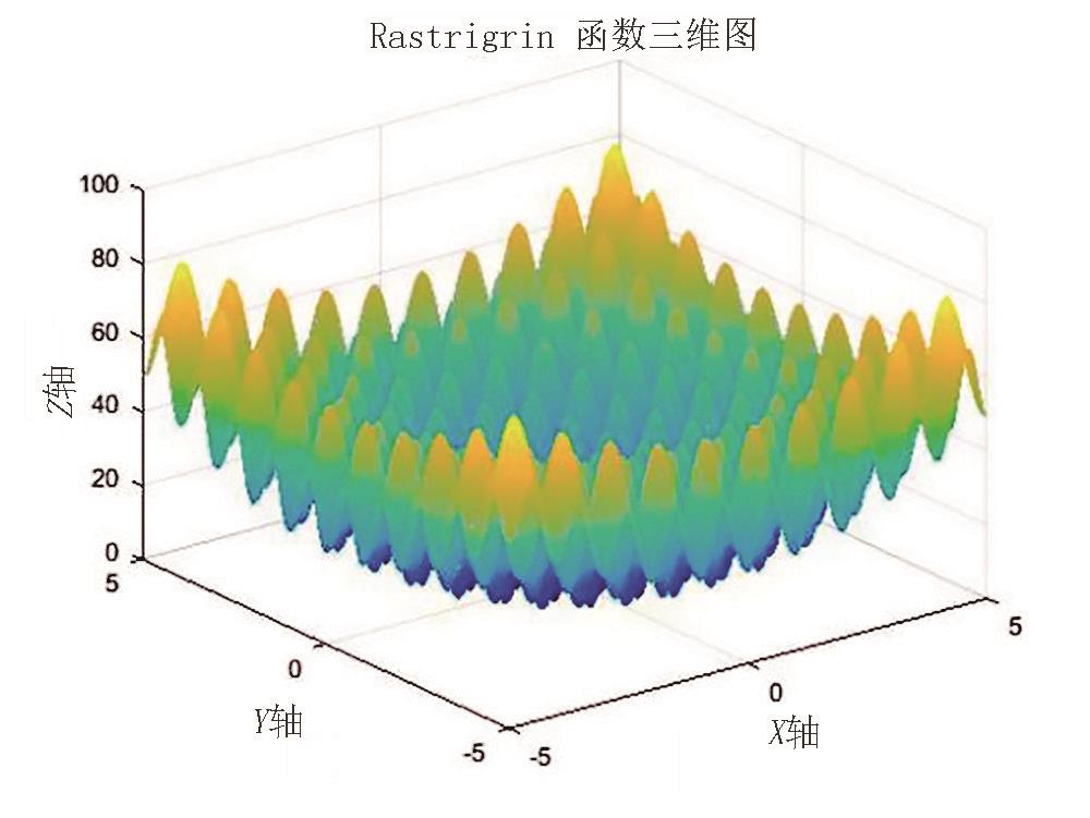 式中:c1s为自我认知学习因子c1的初始值;c1e为自我认知学习因子c1的最终值;c2s为社会认知学习因子c2的初始值;c2e为社会认知学习因子c2的最终值。 改进后的PSO-GA混行优化算法流程与改进前基本一致,两者之间的不同,主要表现在改进前PSO-GA算法的惯性权重系数ω、自我认知学习因子c1和社会认知学习因子c2都是给定的值,而此处改进后的PSO-GA混行优化算法给出的则是惯性权重系数的ω最大与最小值,自我认知学习因子c1和社会认知学习因子c2的初始值与最终值,它们随着迭代代数的增加而线性递增或递减。相应地,在算法程序中做出改变。 2 测试函数仿真通过设置不同的种群规模,分别用基本粒子群算法和PSO-GA优化算法对Rastrigrin测试函数进行求解测试,分析改进后的混行算法的寻优性能。Rastrigrin函数表达式为: