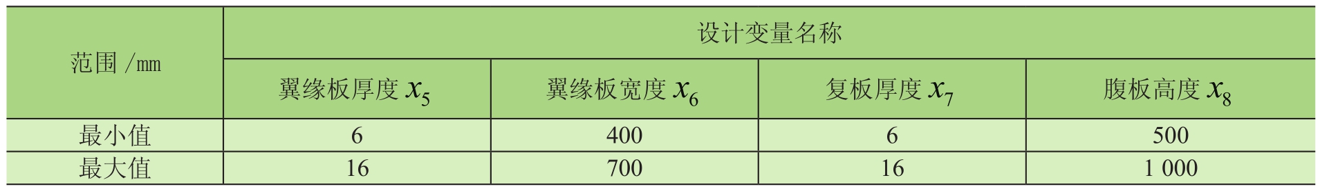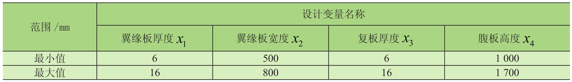 图7表明,当种群规模N=100时,种群规模足够大,PSO算法和PSO-GA算法都求解得到全局最优值,并表现出较好的收敛趋势,但PSO-GA算法收敛速度明显较慢。 通过设置不同的种群规模N,从两次仿真结果对比,不难看出在引入遗传算法的交叉算子以后,丰富了种群个体的多样性,能够有效避免粒子群算法因种群样本数量不足而陷入局部最优的现象,使PSO算法的性能得到进一步改善,表明PSO-GA算法在寻优方面具有更好的鲁棒性。综上所述,PSO-GA算法比PSO算法在寻优过程的稳定性和搜索精度方面得到明显的改善,本文提出的PSO-GA优化算法能够稳定的求解到函数的最优解。 3 桥式起重机桥架结构轻量化设计构造轻量化设计的数学模型,有n个设计变量: