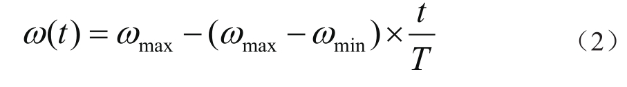 通过对式(1)分析可知,自我认知惯性权重系数ω、自我认知学习因子c1和社会认知学习因子c2是影响粒子速度更新的关键因素,这些参数的调整很大程度上控制粒子的运动,决定了算法的性能优劣。 自我认知惯性权重系数是一个最重要的参数,ω的取值越大,表示粒子运动惯性越大,体现出粒子维持原来速度的欲望越强烈,导致粒子的位置Xi的变化就越大,这样不断循环扩展了粒子的搜索空间,所以较大的ω有利于算法进行全局寻优,但求解精度难以保证。反之ω取值越小,有利于算法进行局部寻优,同时也容易导致算法陷入局部最优。所以,合理地设计自我认知惯性权重系数是保证算法寻优性能的关键,为了平衡PSO-GA算法的全局与局部寻优能力,本文采用动态自我认知惯性权重系数,其表达式为: