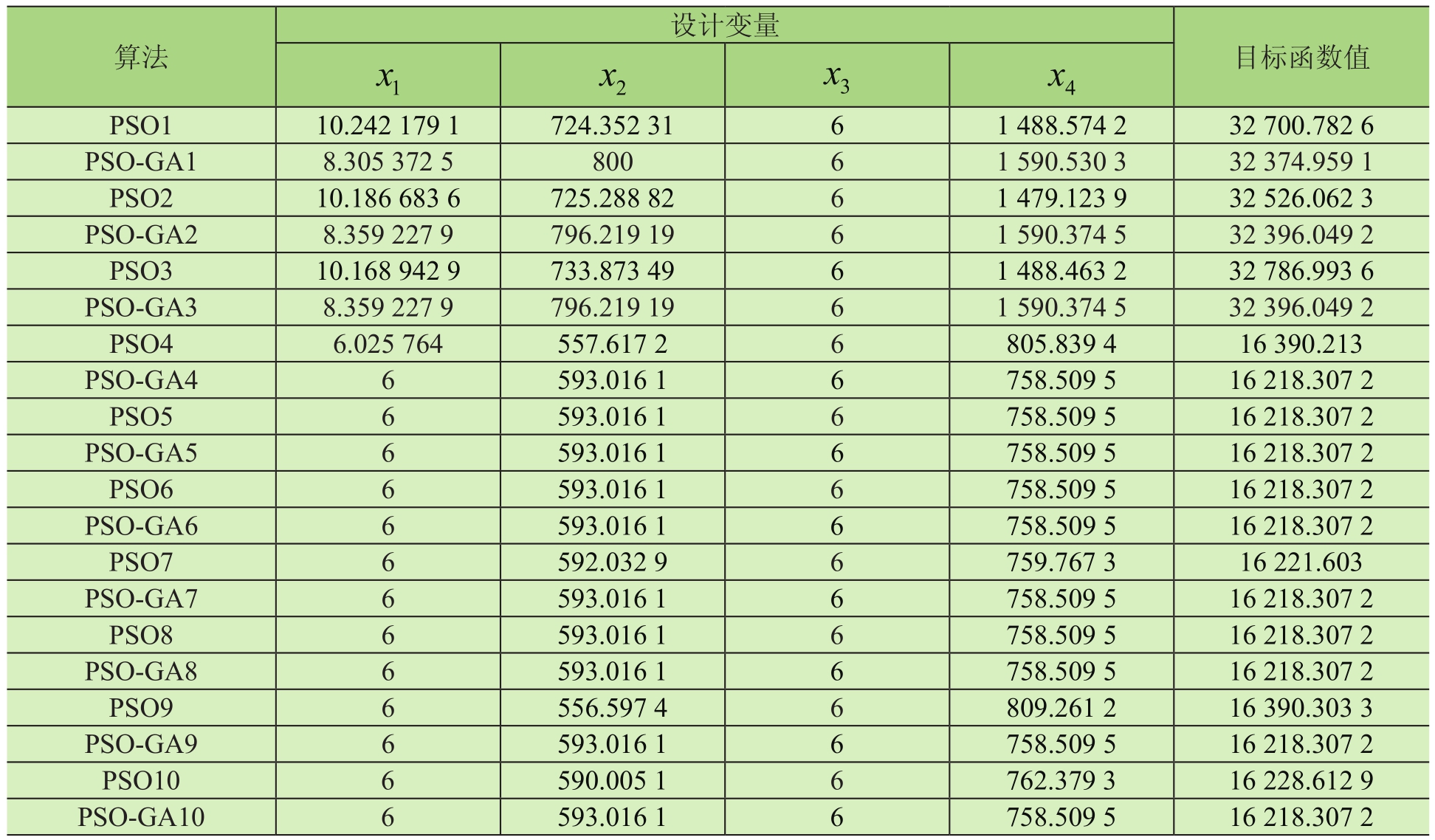 图8两种不同算法的迭代对比图中表明:与粒子群算法相比,改进的PSO-GA算法迭代结果良好,优化效果明显。基本粒子群算法在迭代次数为40代附近寻找到全局最优解,PSO-GA算法在迭代次数为140代附近寻找到全局最优解,获得的最优迭代解比PSO算法的最优解小,从图中可以直观的看出PSO算法寻优精度较低。充分验证了PSO-GA算法的有效性和优越性。 该起重机的设计参数如表3所示,主梁轻量化设计变量取值范围如表4所示,端量梁轻量化设计变量取值范围如表5所示。随机选取PSO算法和PSO-GA算法在种群规模为300时,程序迭代结果的10组数据进行整理,观察算法迭代寻优数据的变化,优化结果如表6所示。 表 3 起重机设计参数表