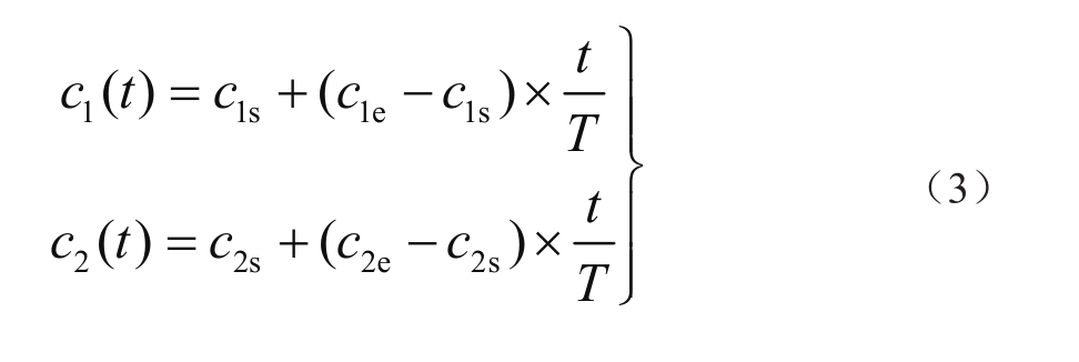 式中: 为自我认知惯性权重系数ω的最大值, 为自我认知惯性权重系数ω的最小值,t为算法的当前迭代次数,T为算法的最大迭代次数。 分析式(2)可知:当程序刚开始运行t为1时,自我认知惯性权重系数ω取值为ωmax;随着程序运行,迭代次数的不断增加,ω呈减小的趋势。通过ω的动态变化,使算法在运行初期粒子能够不断扩展搜索空间,有助于算法进行全局寻优,而在算法运行后期,大部分粒子都集中在最优解附近,更加注重的是算法的局部开发能力以发现精确解。因此,通过自我认知惯性权重的自适应调节,算法能够根据当前迭代次数动态地给出粒子不同的自我认知惯性权重,全局性地改进算法的寻优性能。 自我认知学习因子c1是PSO-GA混行算法速度状态方程中用于调节粒子向个体极值运动的重要参数,社会认知学习因子c2是用于调节粒子向种群历史极值运动的重要参数。 当c1取较大值时,粒子倾向于往个体极值的方向运动,这样可以减缓粒子的趋同性,种群样本可以得到保留,有助于算法全局寻优;当c2取较大值时,粒子倾向于往历史极值的方向运动,这样个体的趋同性更加强烈,有助于算法局部寻优。通过对速度状态方程的分析,容易得出PSO-GA算法在运行初期,设置较大的c1和较小的c2可以有效避免算法早熟收敛于局部极值;而在算法运行后期,设置较小的c1和较大的c2,有助于算法进行全局寻优,于是在文中设计了线性递减的自我认知学习因子和线性增加的社会认知学习因子,其计算公式为: