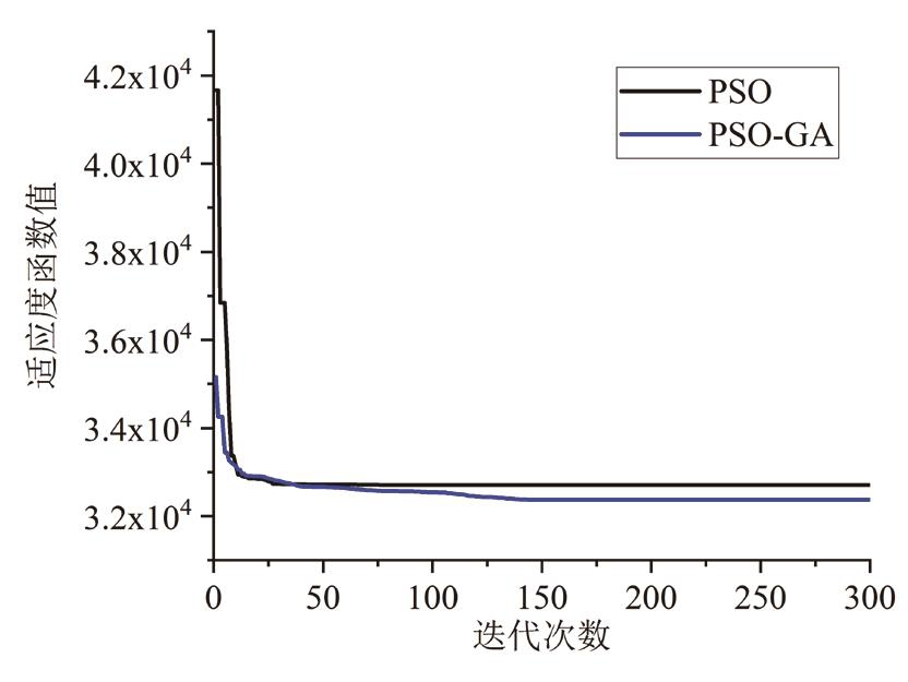 式中:P为不等式的约束个数,q为等式的约束个数。 轻量化设计数学模型是实际问题抽象的表达,也是进行优化设计的基础。为了得到满意的设计结果,应分析工程实际问题的简繁程度,建立精确数学模型的同时,构造模型应尽量简单,提高计算机求解速度和精度。 本文选取基本粒子群算法与引进遗传算子改进的PSO-GA优化算法对桥式起重机箱型桥架结构进行轻量化设计,并对两种算法结果分析。 对主梁轻量化设计,设置PSO算法和PSO-GA算法的种群规模皆为300,最大迭代次数为300次,其他参数保持不变。用Matlab软件分别运行程序20次,随机抽取一次实验结果,绘制收敛过程图进行对比分析,如图8所示。  图8 收敛过程对比