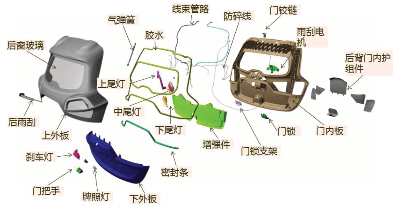 塑料后尾门集成化是指将塑料后尾门模块进行集成,各部件通过直接安装在塑料后尾门上,形成一个整体部件。图2所示即为集成化的塑料后尾门,其根据功能需求不同包括后挡风玻璃、后雨刮、上外板、刹车灯、门把手、牌照灯、下外板、气弹簧、尾灯、密封条、门锁及其支架、线束管路、防碎线、门铰链、雨刮电机、后背门内护板组件等部件。通过把塑料后尾门模块进行集成化,有效利用汽车尾部空间,实现后尾门轻量化。
