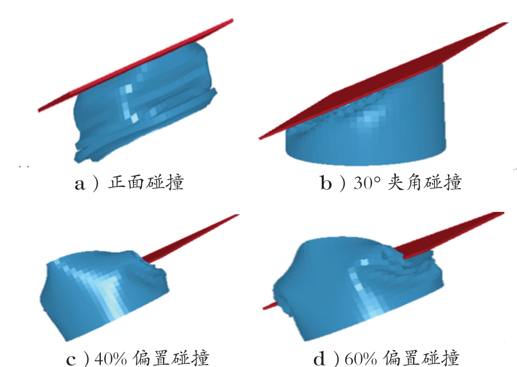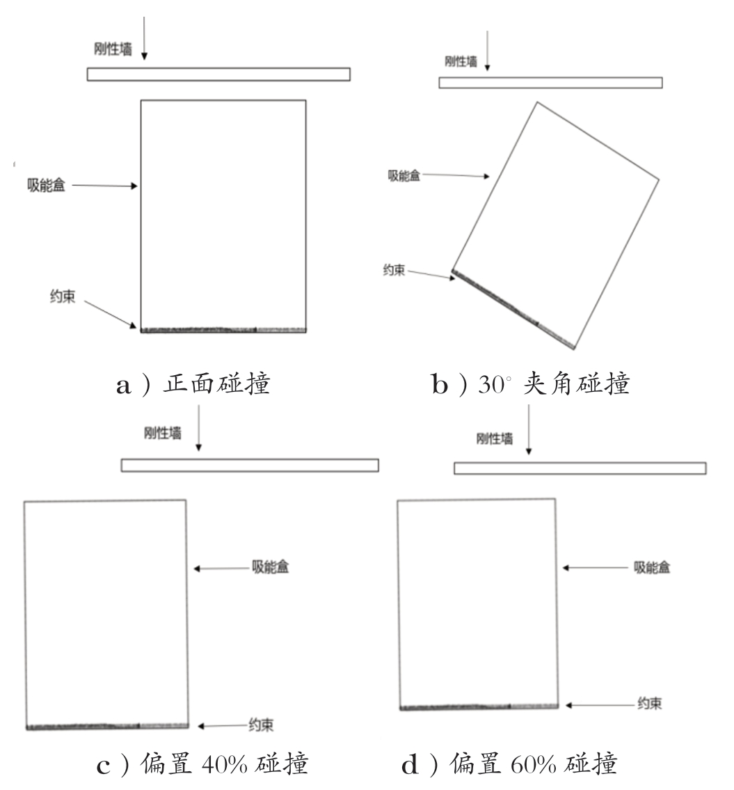 1.2 低速碰撞工况针对汽车低速碰撞安全性,许多国家制定了不同的乘用车保险杠低速碰撞法规,虽然不同法规的评价标准和要求不一样,但是都是以真实汽车碰撞事故为基础制定的,都是为了保障汽车低速碰撞安全性能。本文参照欧洲ECE-R42 法规、美国Part81 法规、加拿大CFVSS215,将它们设计成4种工况,如表1、图2所示,该碰撞过程简化为在不同的工况下保险杠吸能盒受到质量为500 kg 的刚性平面墙以速度为18 km/h撞击。  图2 碰撞工况