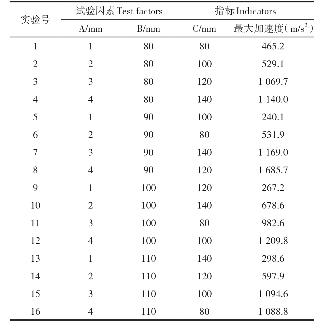 2.2 试验结果分析根据正交表L16(43)将各水平因素进行组合,然后完成仿真试验,正交试验取值标准选取刚性墙壁质心处x、y、z三个方向的最大加速度,得到如表3所示的试验结果。 表3 正交优化试验结果