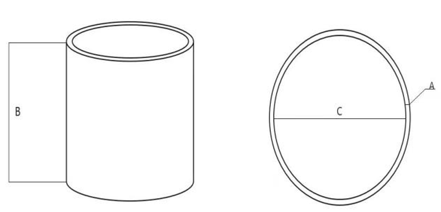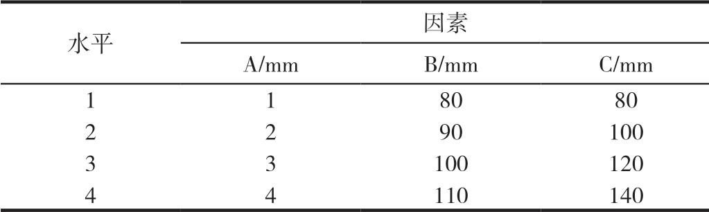 2 正交试验设计正交试验法是一种科学的优化方法,主要是利用正交表科学合理地搭配各因素水平,从而在不影响试验质量的情况下,减少实验数量,得到最优的水平组合[6-7]。 2.1 因素和水平的选取保险杠吸能盒的尺寸如图3 所示,主要为吸能盒厚度A、吸能盒直径B、吸能盒长度C。3个因素中的任意一个改变都会影响试验结果,因此作为正交试验的3个因素。  图3 保险杠吸能盒尺寸