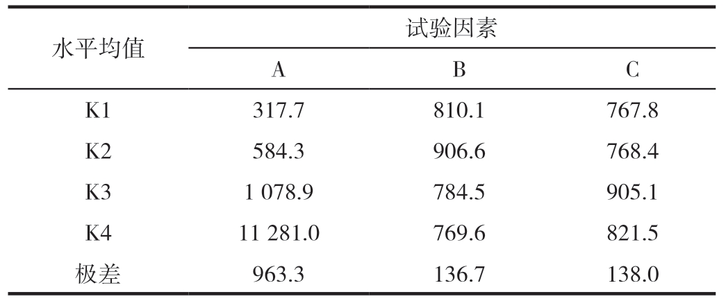 为了更加简洁明了地比较各水平因素的好坏,对表中的各因素的水平计算平均偏差和K值以及极差R,列于表4中。 极差的大小可以评价因素水平变化对试验结果影响的大小,其数值越大,说明该因素对试验结果影响越大。表4数据说明3 个因素对试验的影响大小排序为A >C >B,得到本实验最佳组合:A1B4C1,即吸能盒厚度A=1 mm、直径B=110 mm、长度C=80 mm。 表4 正交试验极差分析结果
