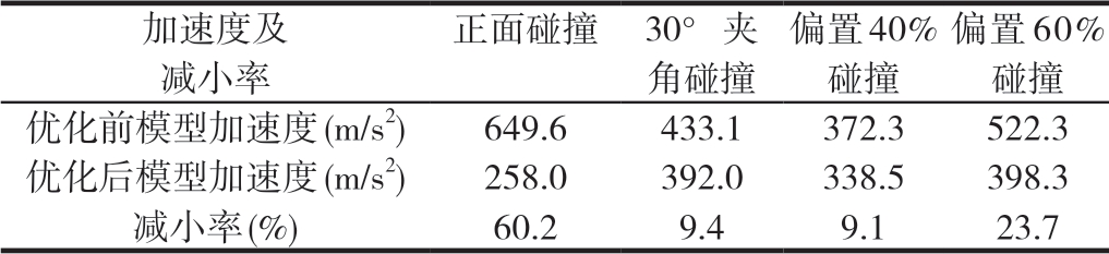 如图4 所示,在碰撞过程中,保险杠吸能盒发生了较大的变形,承担了减轻冲击和吸收能量的主要作用,可以很好地保护车辆和乘员。 车辆发生碰撞时一般选用加速度来衡量事故的严重性。如果碰撞时所产生加速度越大,乘员受到的危害就越大,因此,减小碰撞加速度对保险杠吸能盒的研究是很有意义的。为了进一步观察保险杠吸能盒的吸能效果,将优化前与优化后吸能盒加速度峰值进行对比,优化前后4种工况加速度峰值数据如表5所示。 表5 模型加速度比较