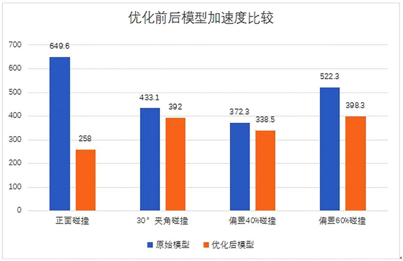 从表5和图5可以看出加速度峰值的对比结果:正面碰撞时,优化后模型的加速度峰值比优化前的加速度减少了60.2%;30°夹角碰撞时,优化后比优化前的加速度峰值减少了9.4%;偏置40%碰撞时,优化后比优化前的加速度峰值减少了 9.1%;偏置60%碰撞时,优化后比优化前的加速度峰值减少23.7%。从数据分析中可以看出优化后的保险杠吸能盒每个工况的加速度峰值比优化前的都小,从而降低了低速碰撞时对乘员身体的伤害,同时也减少了对车辆的破坏性,更能保障车辆的安全性。  图5 优化前后加速度峰值对比