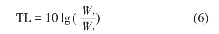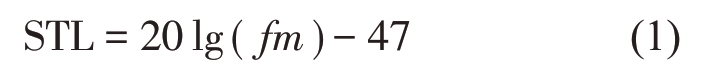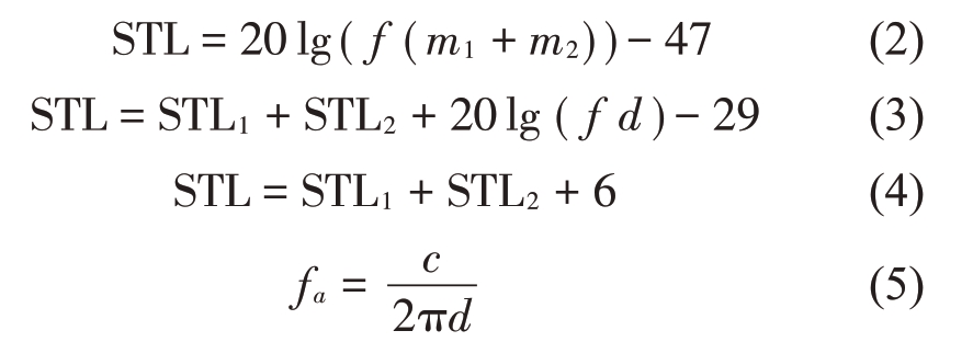 其中:m为单层板面密度,f为频率。 双层板系统包括3个区域,两层板以及中间的空气夹层。由Sharp 推导出的表达式可以在不同频率范围内预测双层板系统隔声性能[6]。 频率在低于系统共振频率fc时传递损失计算公式如式(2)所示;频率在大于系统共振频率fc 且小于双层板系统中空腔共振频率fa时传递损失计算公式如式(3)所示;频率在大于双层板系统中空腔共振频率fa时传递损失计算公式如式(4)所示,空腔共振频率fa计算公式如式(5)所示。