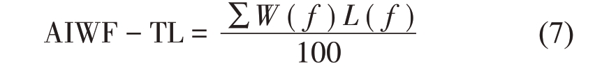 其中:Wi为从声源声腔入射的功率,Wt为传递到接收声腔的功率。 1.4 AIWF-TL理论在TL评价中一般采用各频带数值比较法,但此方法只能粗略判别大致水平,如果性能在不同频带存在增、减相反的趋势,则无法准确评估各频带TL变化对车内语音清晰度改善情况。同时由于人耳对噪声各频带感知水平不同,无法采用取各频带均值的方法进行TL评价。 针对上述问题,结合语音清晰度算法中的主要影响因素,提出AIWF-TL 指标,可对防火墙隔声水平进行评价,其定义如下[7]: