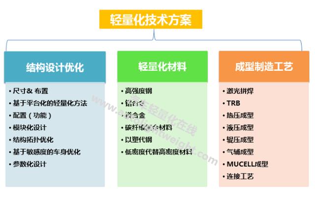 【汽车轻量化在线】汽车轻量化技术的实施首先是设定工程目标,包括汽车的最小质量、汽车的轴荷分布、动态和静态刚度、声学特性和舒适性、被动安全性和满足法规目标、使用寿命和寿命周期等。实现汽车轻量化主要包括设计、材料与制造工艺技术三个方面。 图 1汽车轻量化技术路径示意图 (1)结构优化设计 结构优化设计是汽车轻量化的重要途径之一,是轻量化汽车产品开发的基础和前提。从汽车零部件概念设计、初始结构设计、产品工程设计和样车制造过程来分析结构轻量化的设计,可以抽象出结构设计和分析的基本理论和方法,研究这些理论和方法并加以恰当的综合,是实现结构轻量化的重要途径。轻量化结构设计涉及整车各系统的布置,各系统零件的分布与装配关系,零部件的模块化,零件或系统性能优化等方面。 对连续体结构优化按照设计变量的类型和求解问题的难易程度可分为尺寸优化(尺寸变量)、形状优化(形状变量)和拓扑优化(拓扑变量)三个层次。分别对应于三个不同的产品设计阶段,即概念设计、基本设计及详细设计三个阶段。 整车布置对轻量化也有很大影响,比如在满足车内空间的条件下应尽可能缩小外形尺寸,重量自然会降低。汽车的线束或管路的布置,发动机的前置或后置,悬架的结构形式等等都会影响到汽车的重量。 此外,对白车身等系统模块,还可以通过参数优化或多目标优化来实现轻量化。在概念设计阶段,采用拓扑驱动的方法快速方便实现几何模型建立和修改。能同时对多种设计方案进行快速结构拓扑布局与优化评估,通过对结构形状、拓扑、材料、厚度等方面的优化来实现整车轻量化的目的。采用少数变量控制大量参数变化的技术,使得多参数优化后台自动运行变为现实。使得在概念设计阶段能够快速提供最佳设计方案和可行性分析,节省研发时间和成本。 (2)轻量化新材料 轻量化材料是指可用来降低零部件重量的材料,它有两大类:一类是低密度的轻质材料,如铝合金、镁合金、钛合金、塑料、多孔发泡和塑料复合材料等;另一类是高强度材料,如高强度钢板、热冲压成形钢和高强度铸铁等等。 (3)轻量化成型制造工艺 轻量化成型制造工艺(简称轻量化工艺)是指为了满足高强度材料的应用以及实现零件集成化设计需要所采用的技术。目前应用较为广泛的有激光拼焊板、热冲压成形、柔性轧制板、滚压成型、微发泡成型、半固态成型、液压成型和轻量化材料的连接技术等等。轻量化工艺主要是配合轻量化设计与材料的应用,共同构成轻量化的三个技术途径。 |